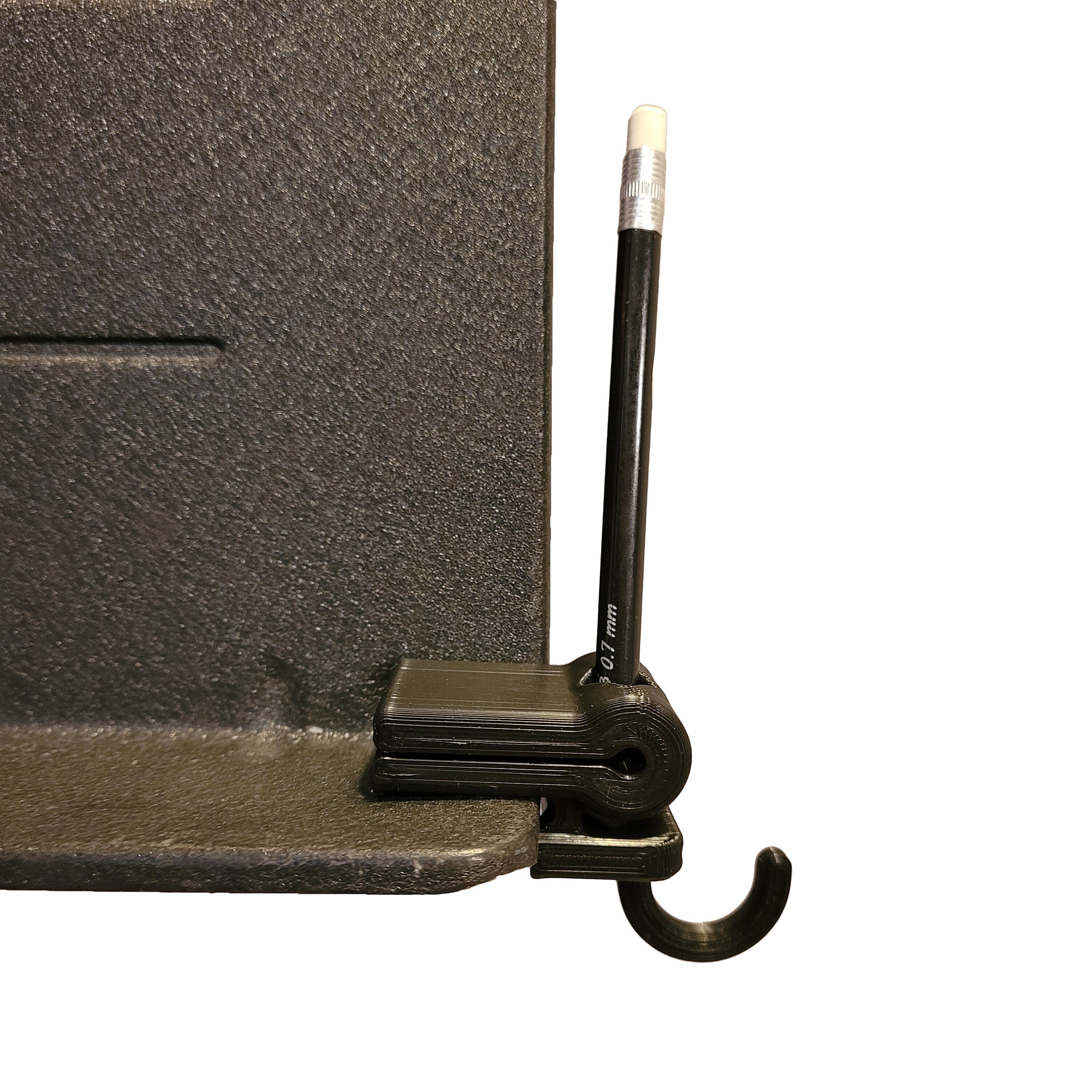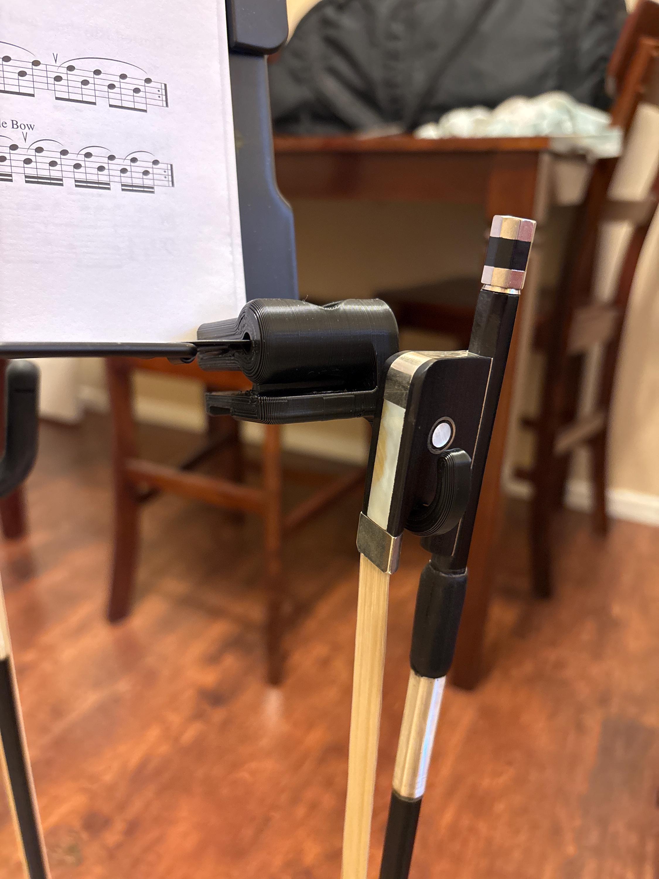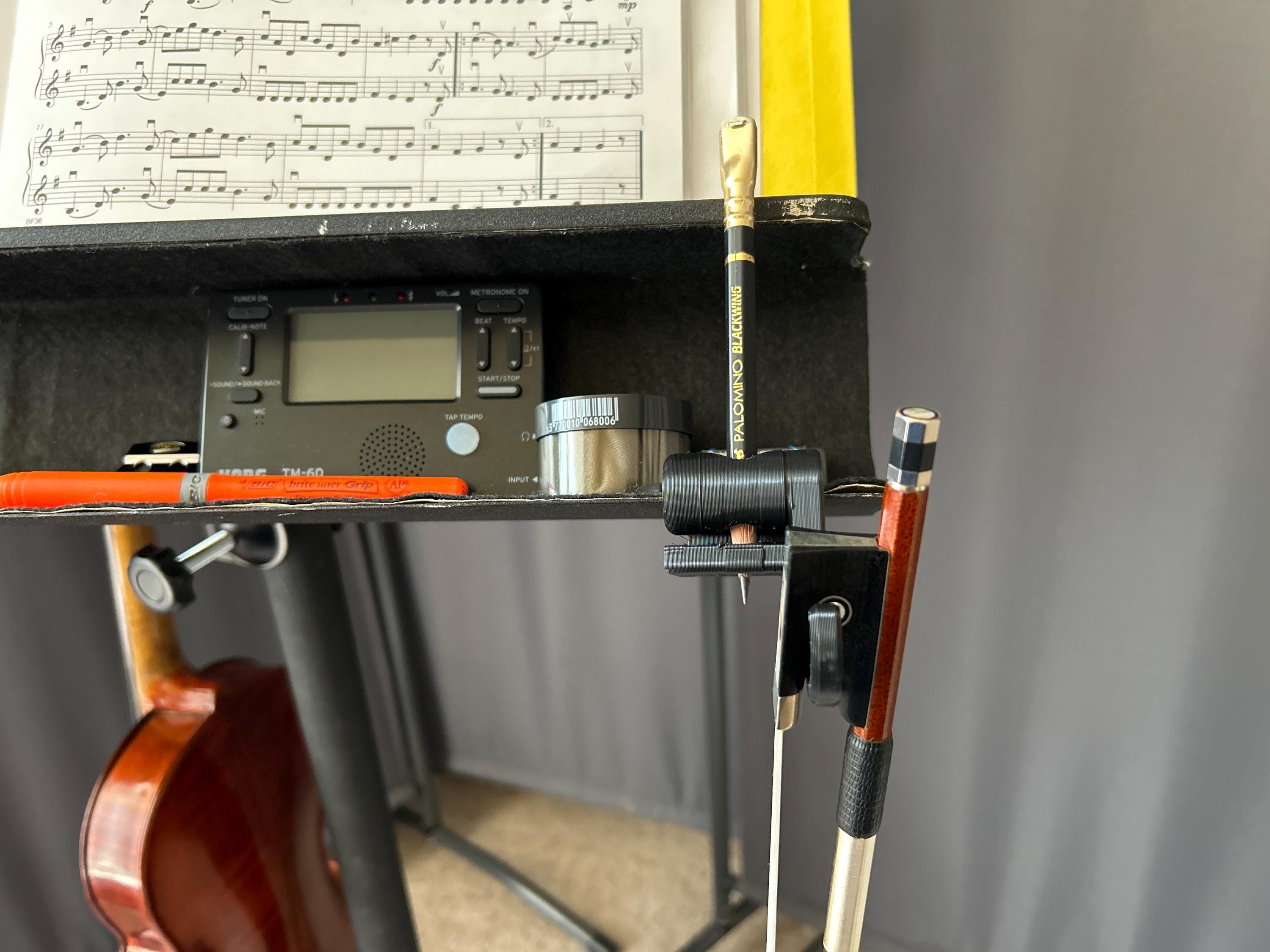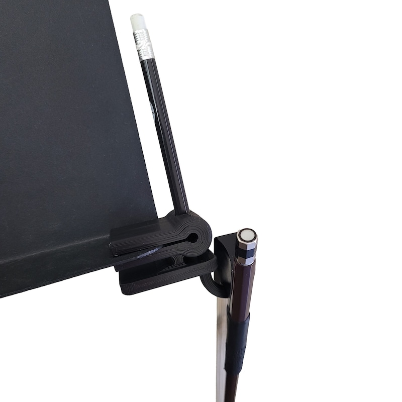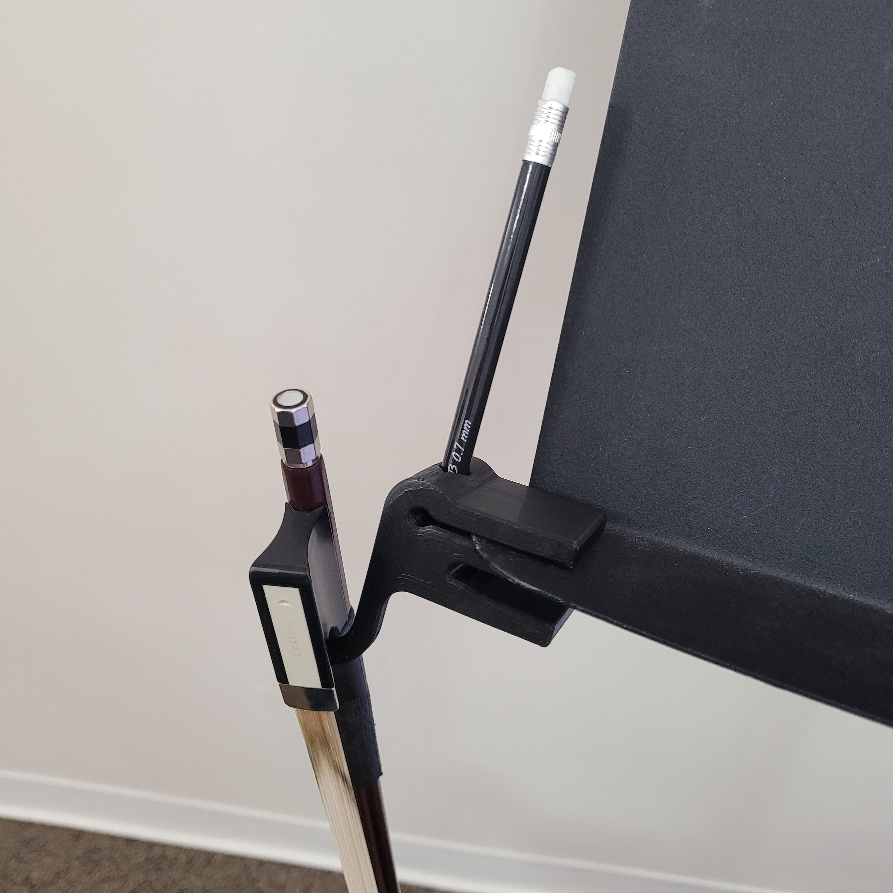 Make practicing easier by keeping your music stand clear of your bow with the Bow Holder for Music Stand. Also comes with a convenient storage for a pencil or pen. Fits most metal music stands and plastic stands (including Wenger). Bow hook will hold most violin, viola, cello, and bass bows.