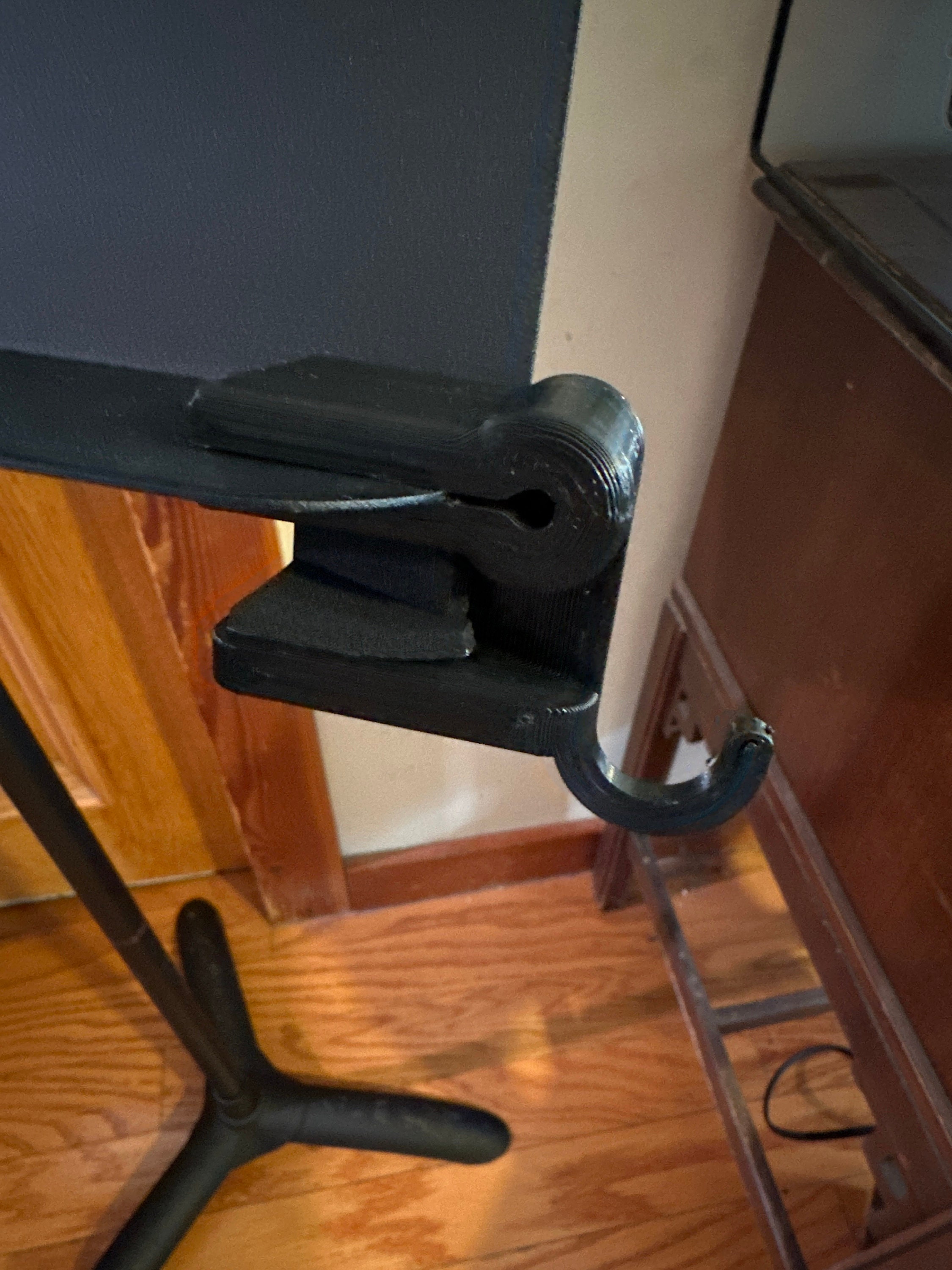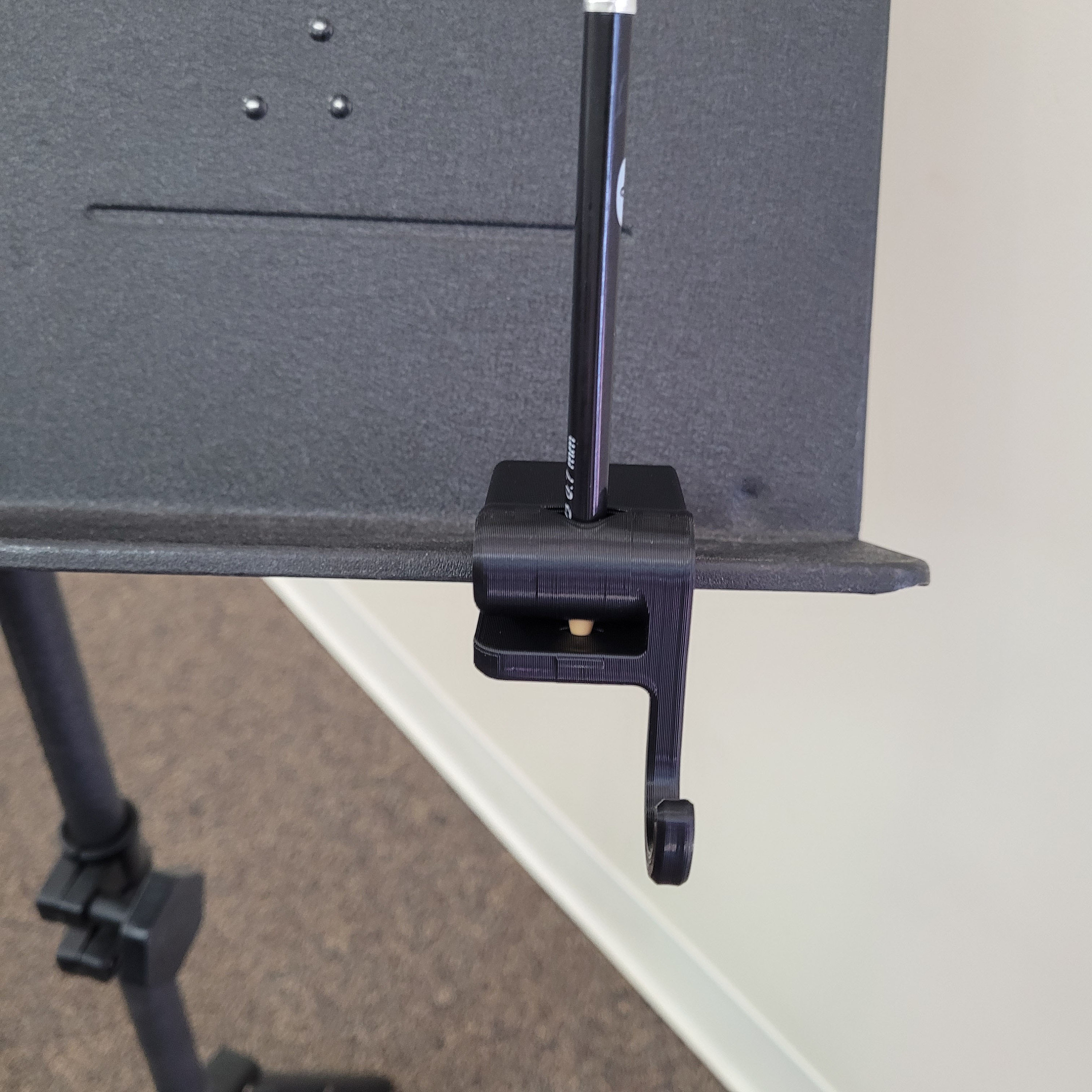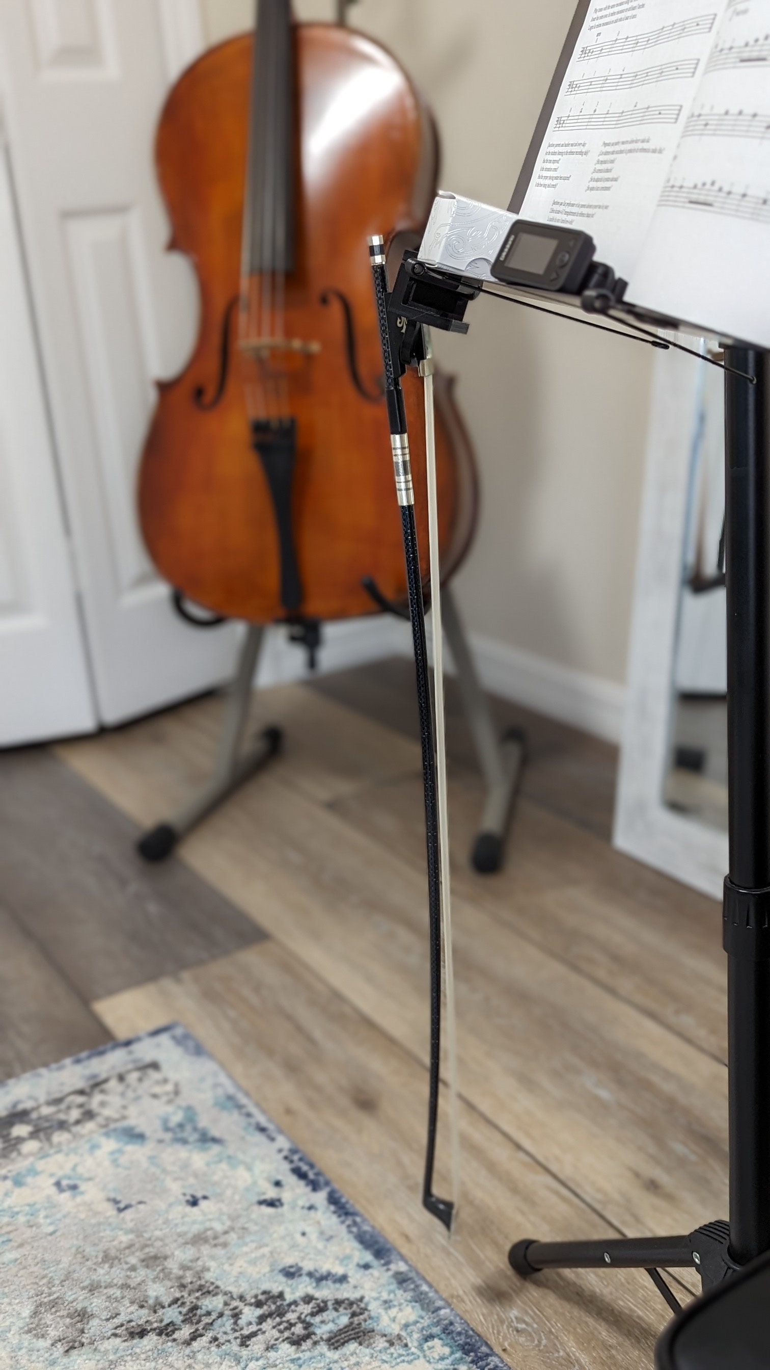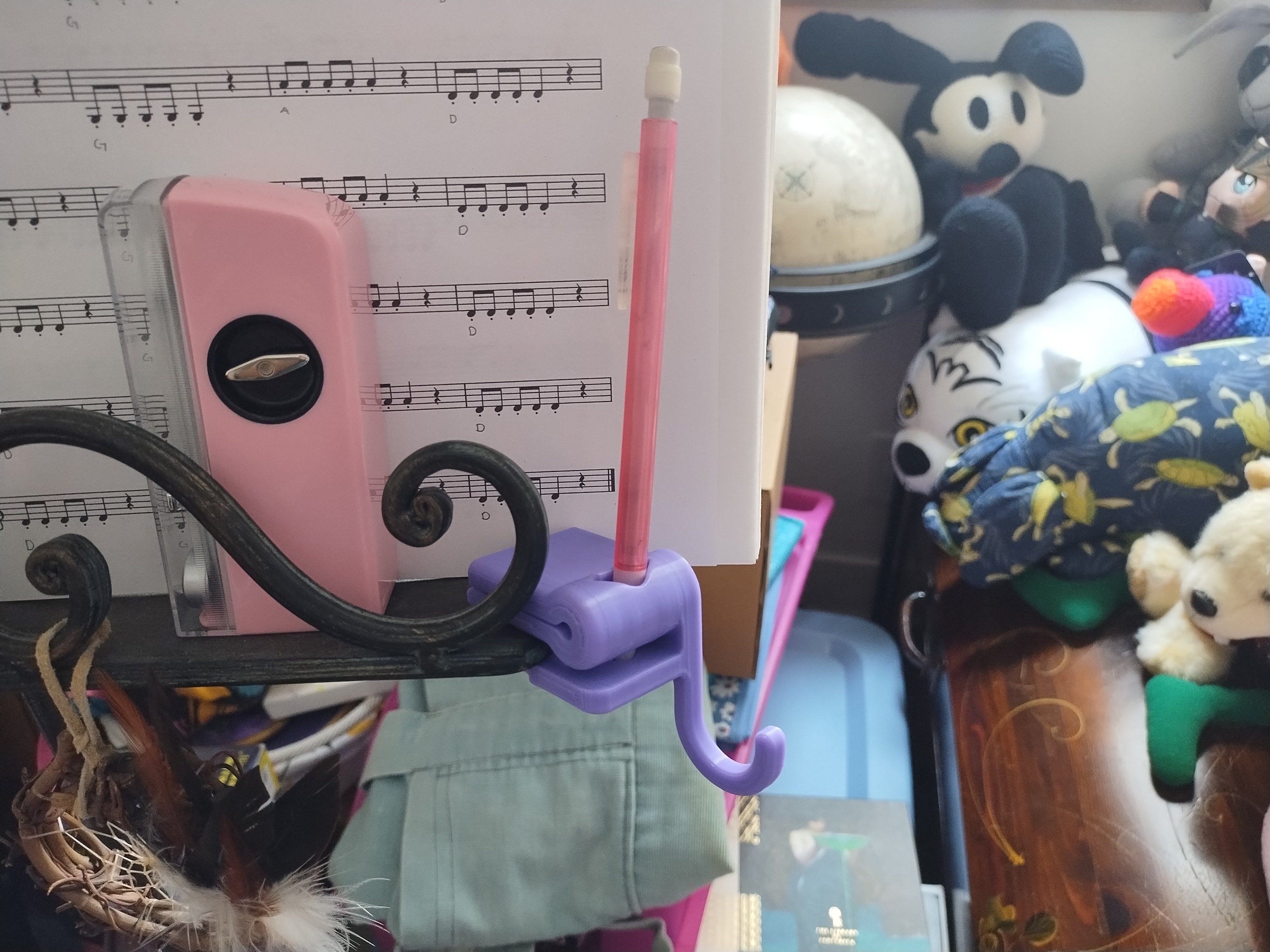 Make practicing easier by keeping your music stand clear of your bow with the Bow Holder for Music Stand. Also comes with a convenient storage for a pencil or pen. Fits most metal music stands and plastic stands (including Wenger). Bow hook will hold most violin, viola, cello, and bass bows.