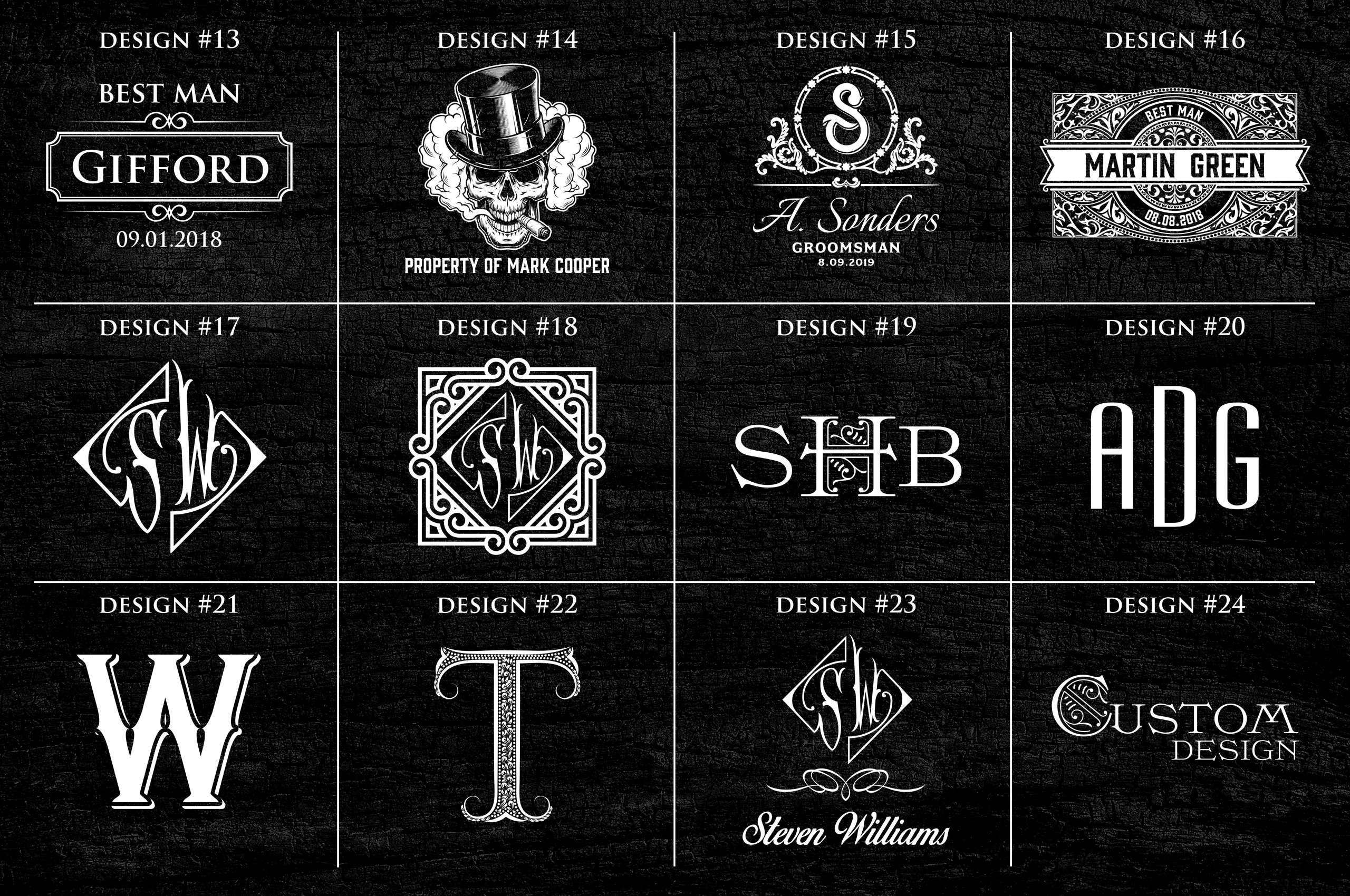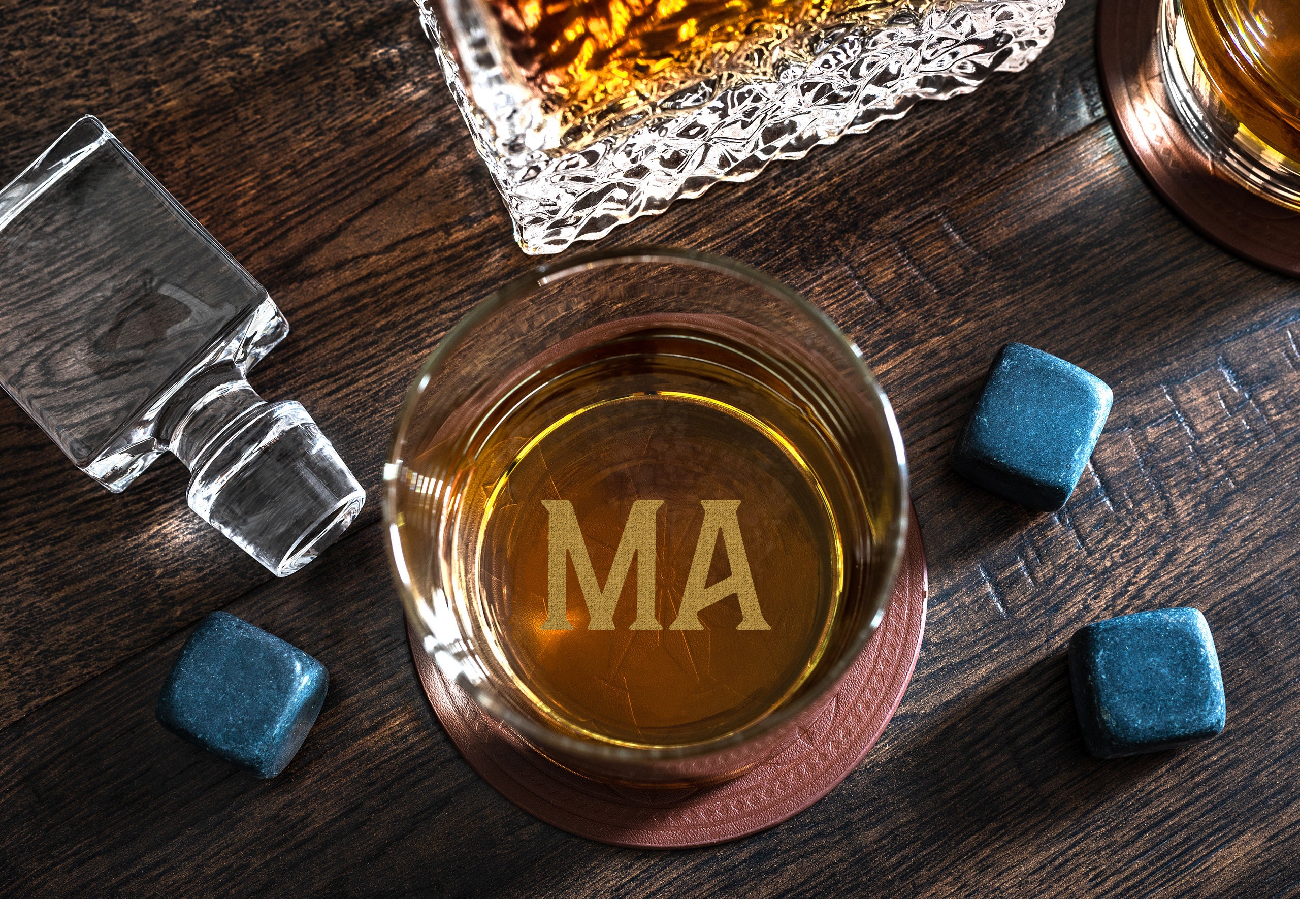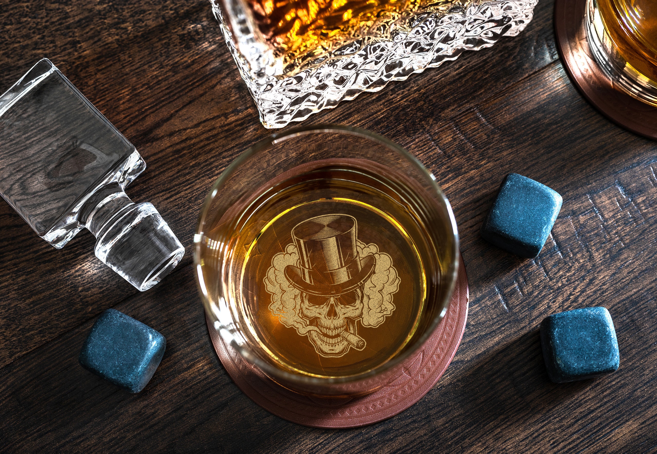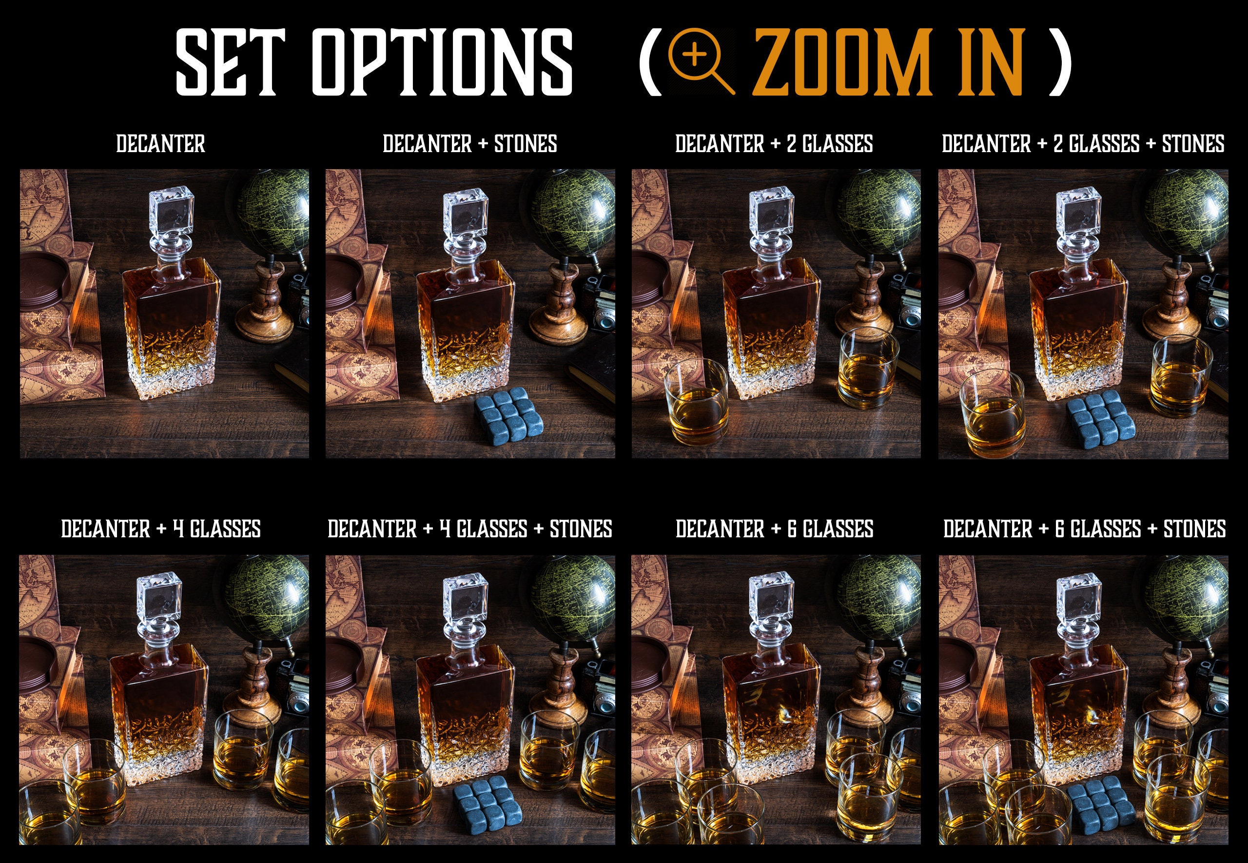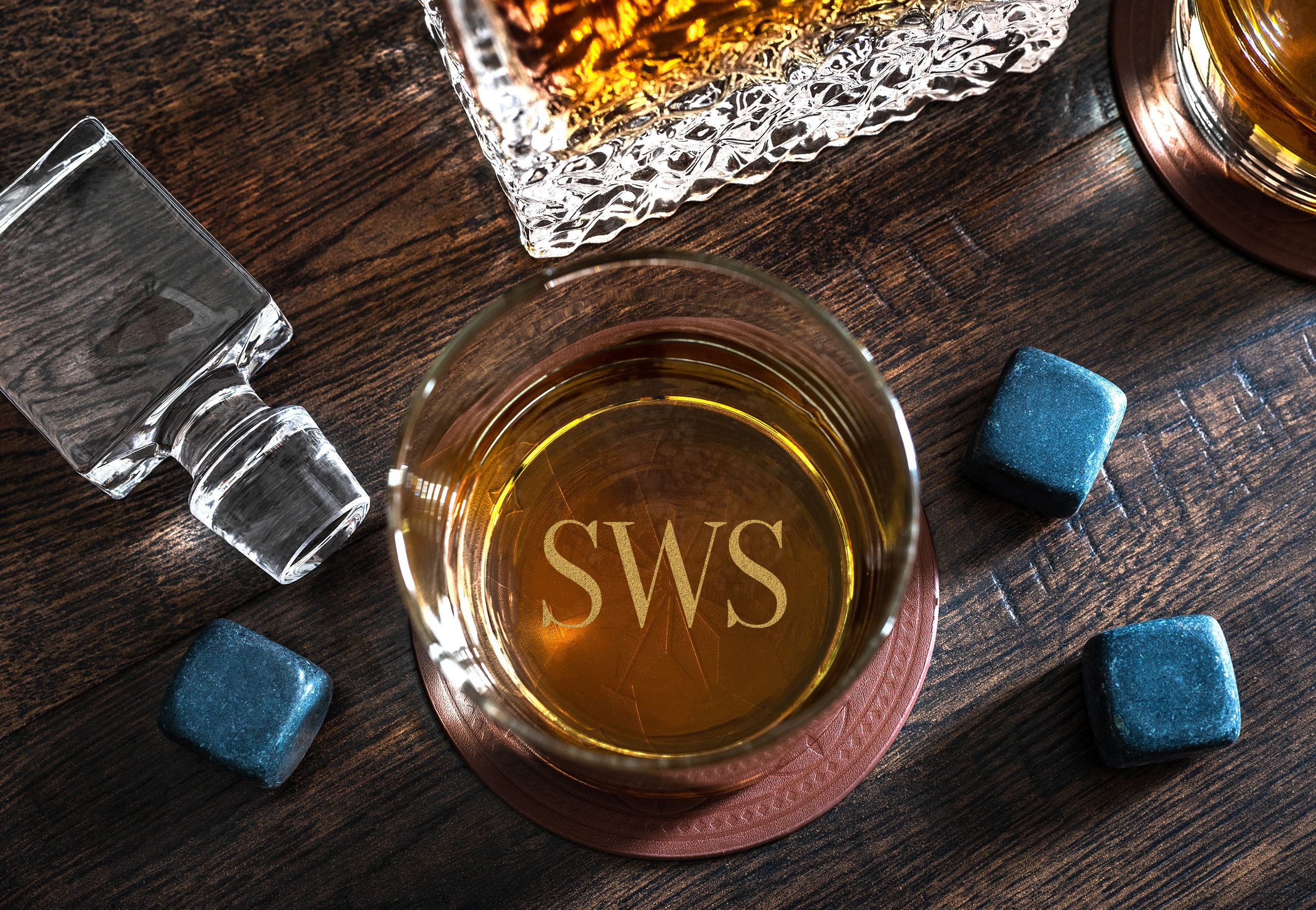 Optional sets of 2/4/6 heavy base 11 oz whiskey glasses are available. (Will be engraved with initial/s or name depends on the design)