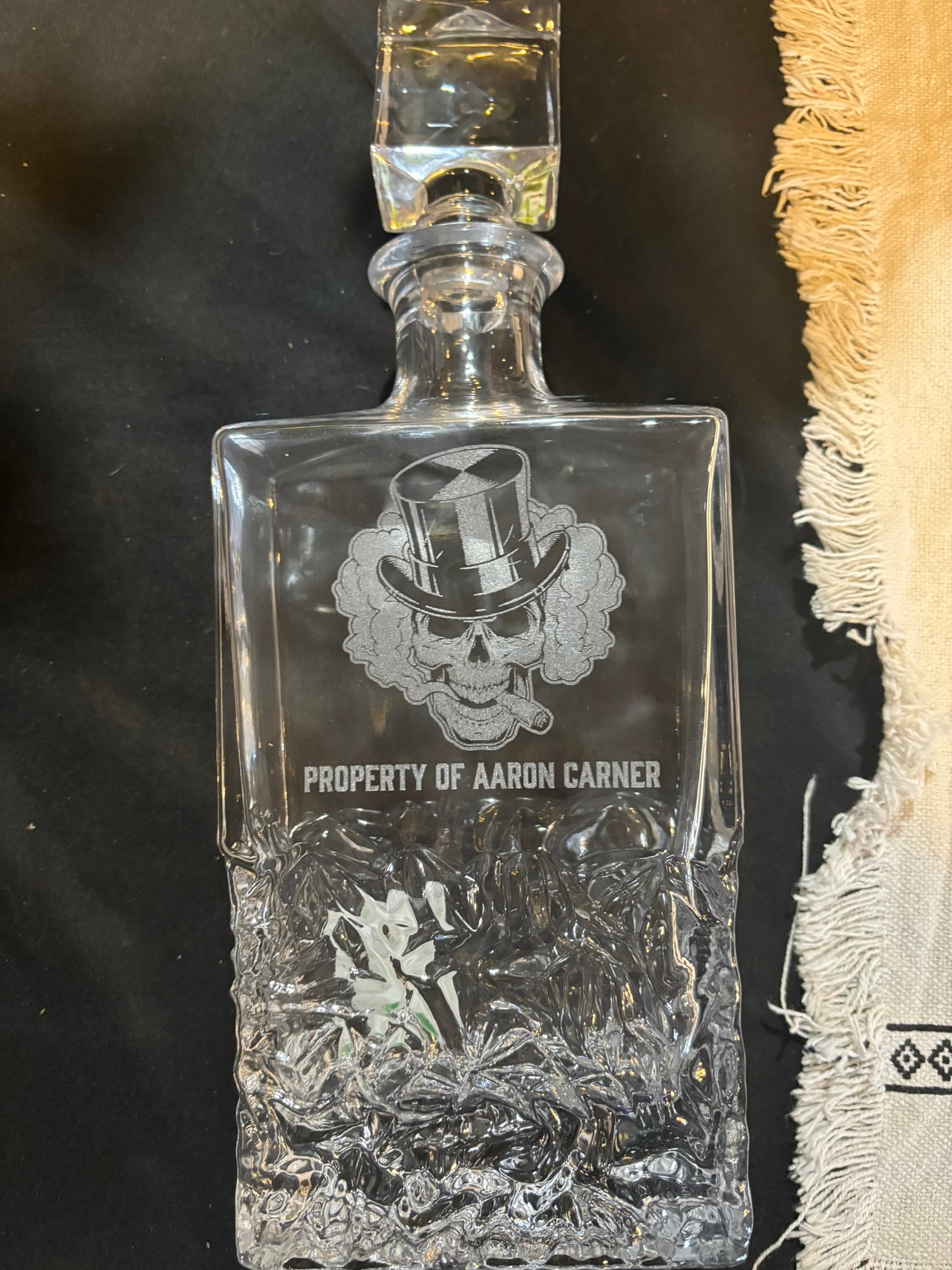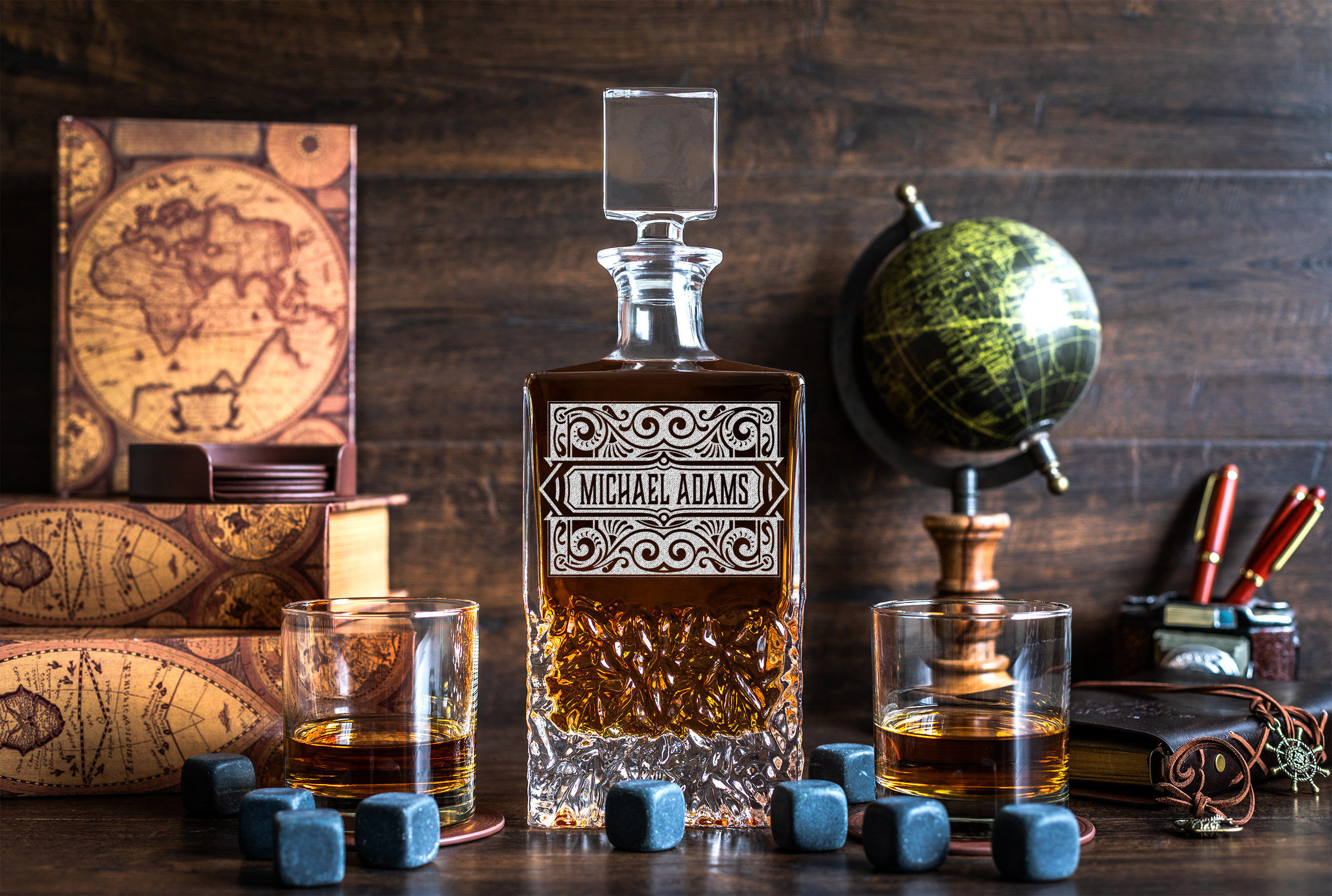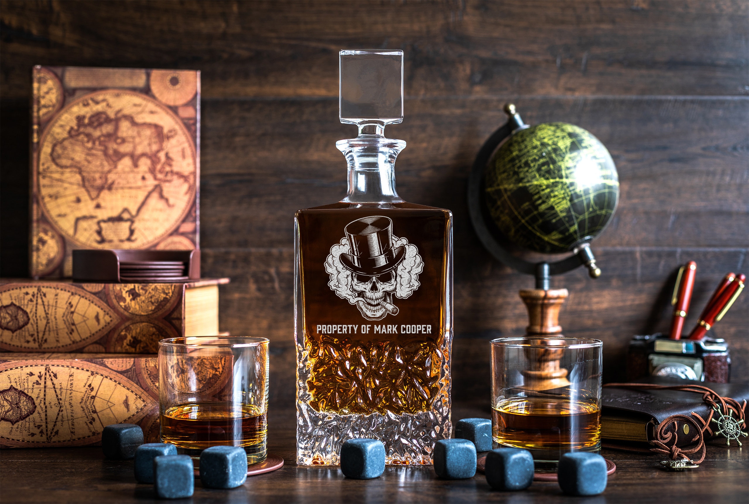 Personalized whiskey decanter and a glasses set can be a great gift for the connoisseur of exquisite drinks. It will be appropriate for a wedding, birthday, anniversary, or office party. Each piece will be engraved using design chosen (from the last pictures) or design of your own (contact seller before placing your order if you'd like custom design). Glasses will be engraved as well on the bottom with initial/s or name depends on the design.
