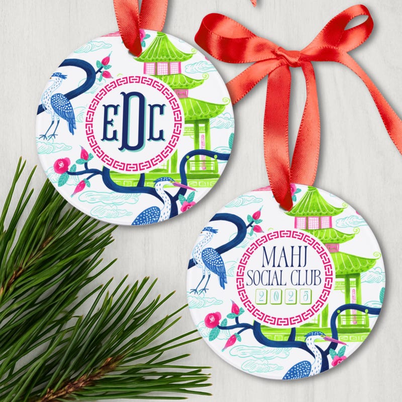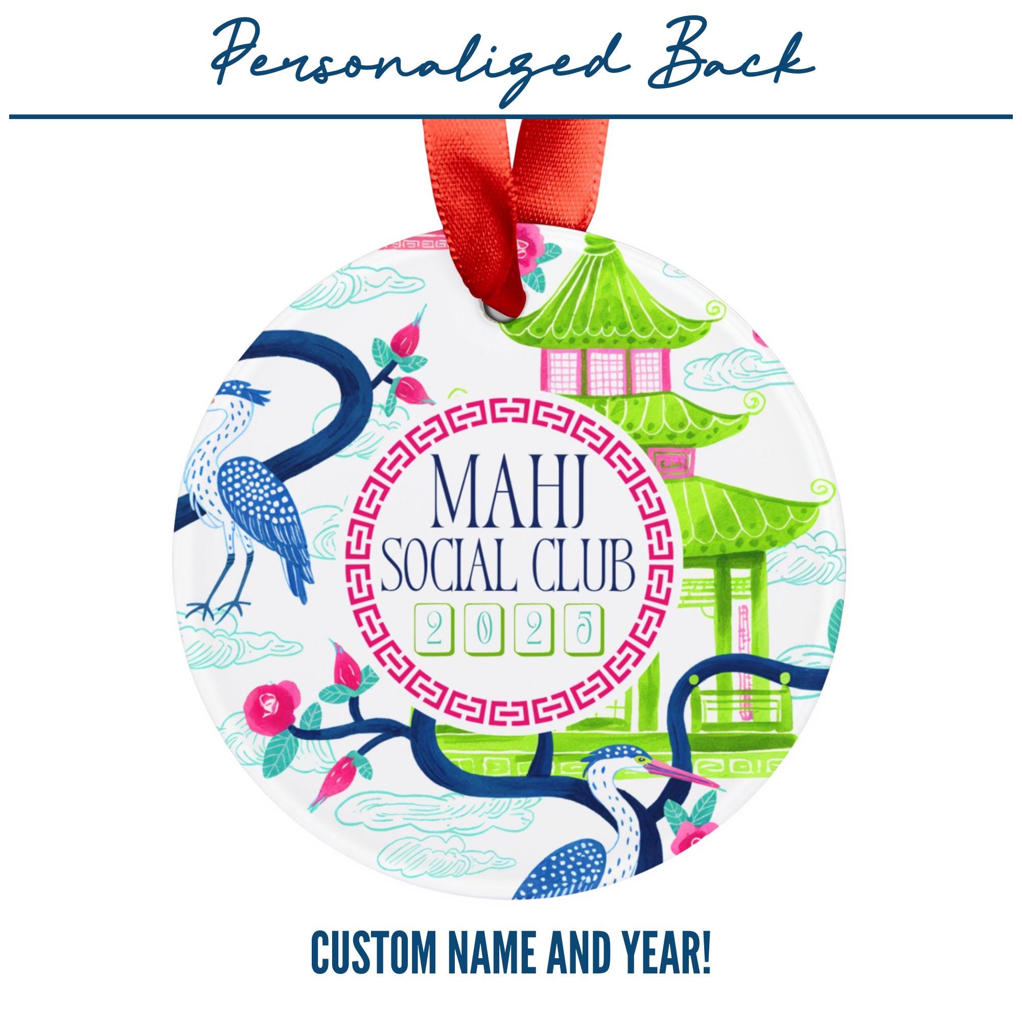 Celebrate your Mahjong group in style with this vibrant chinoiserie ornament — the perfect keepsake for club members and mahj friends. Personalize with a monogram on one side and your club name or year on the other to create a meaningful gift that feels luxe and memorable. A unique way to honor game nights, tournaments, and holiday traditions.