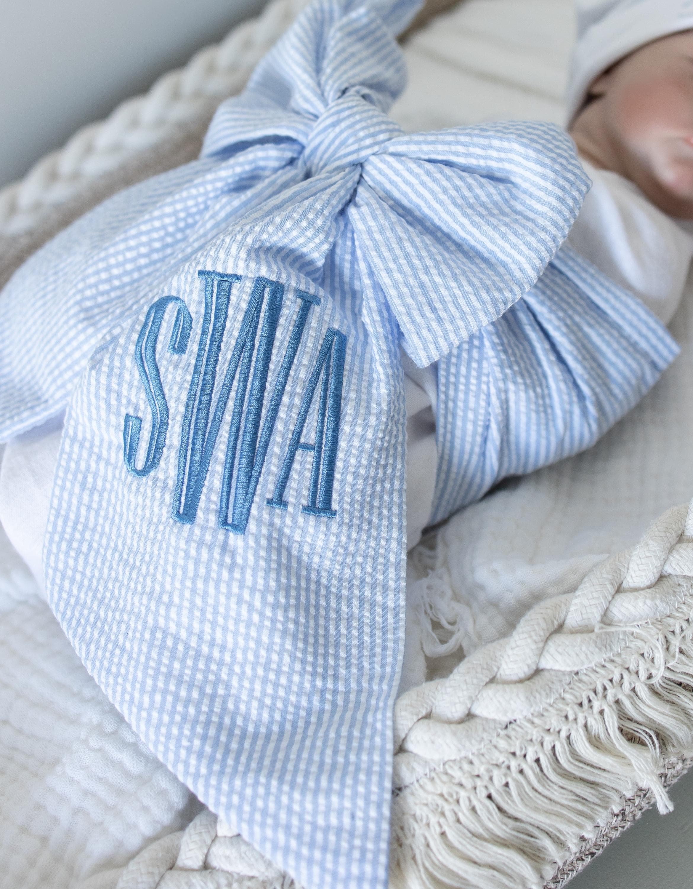 SWA - Light Blue Seersucker Sash Only - Engraved Font - Personalization Style 2 - Denim Blue Thread