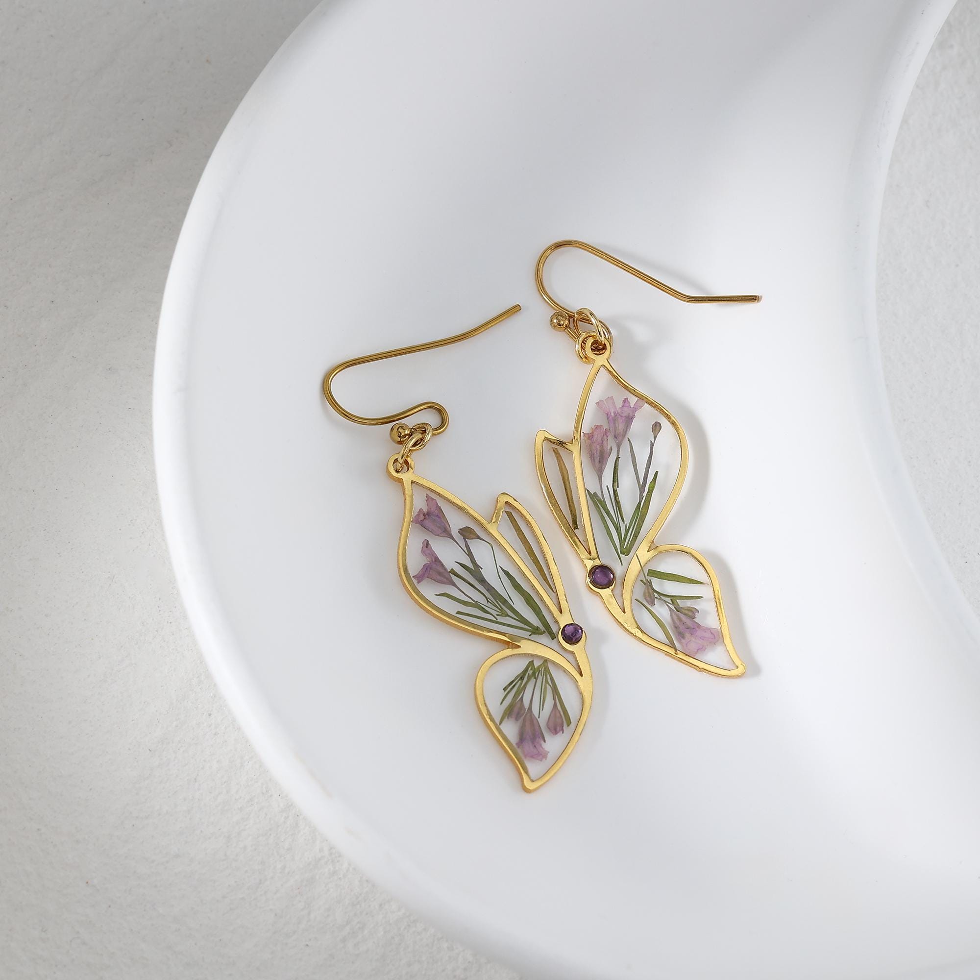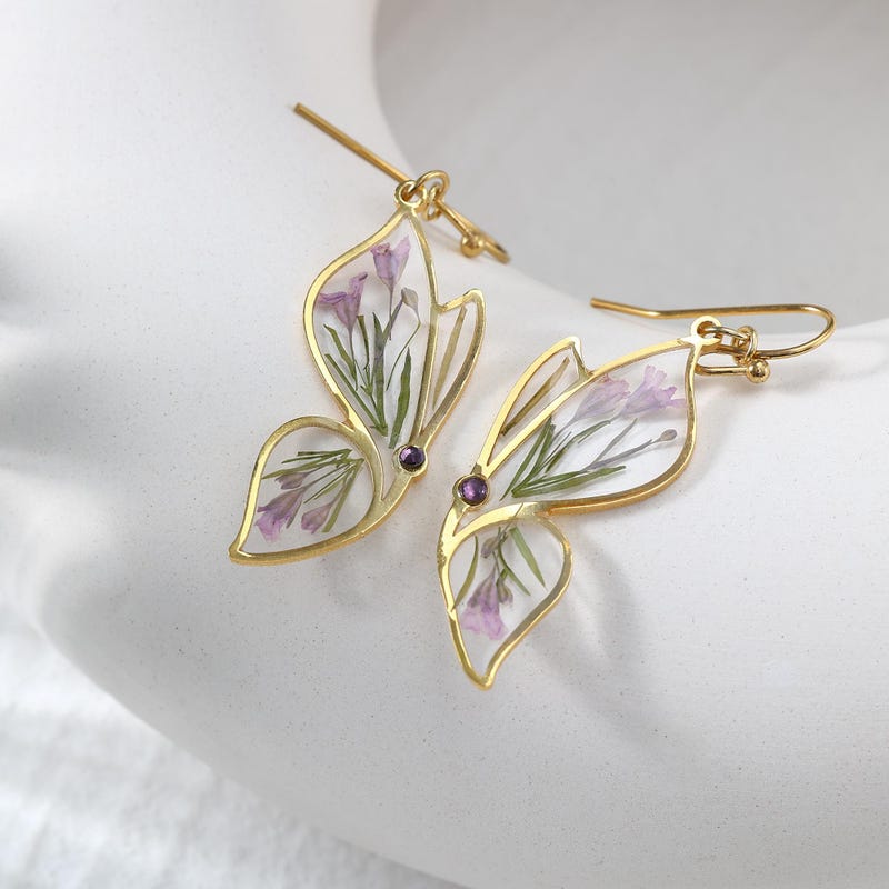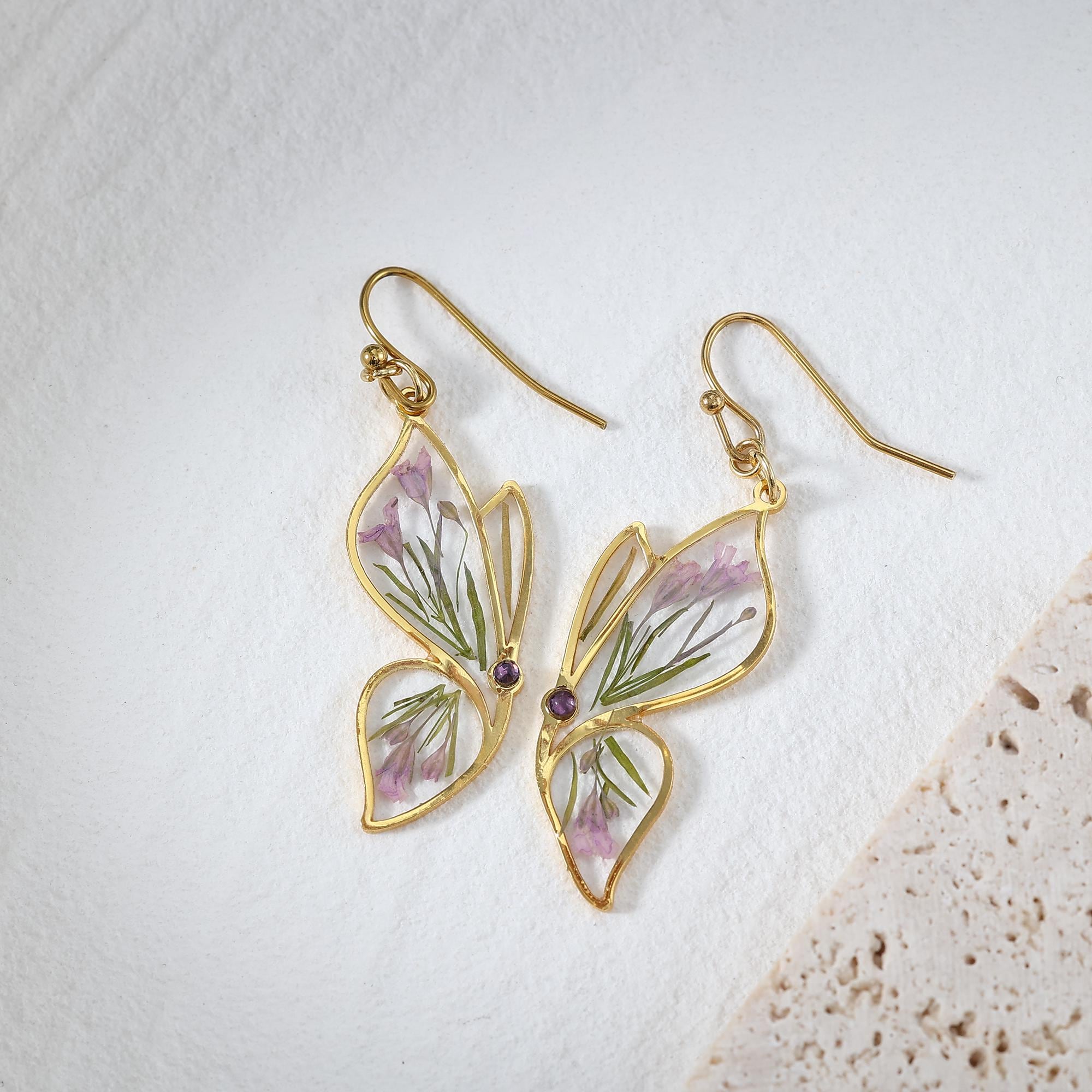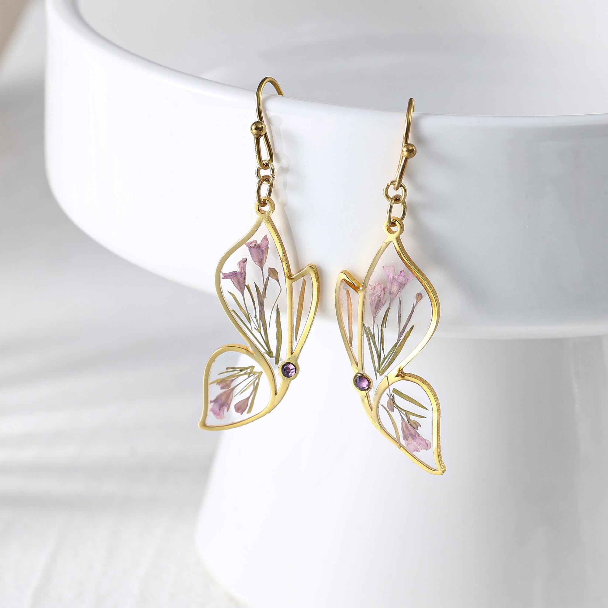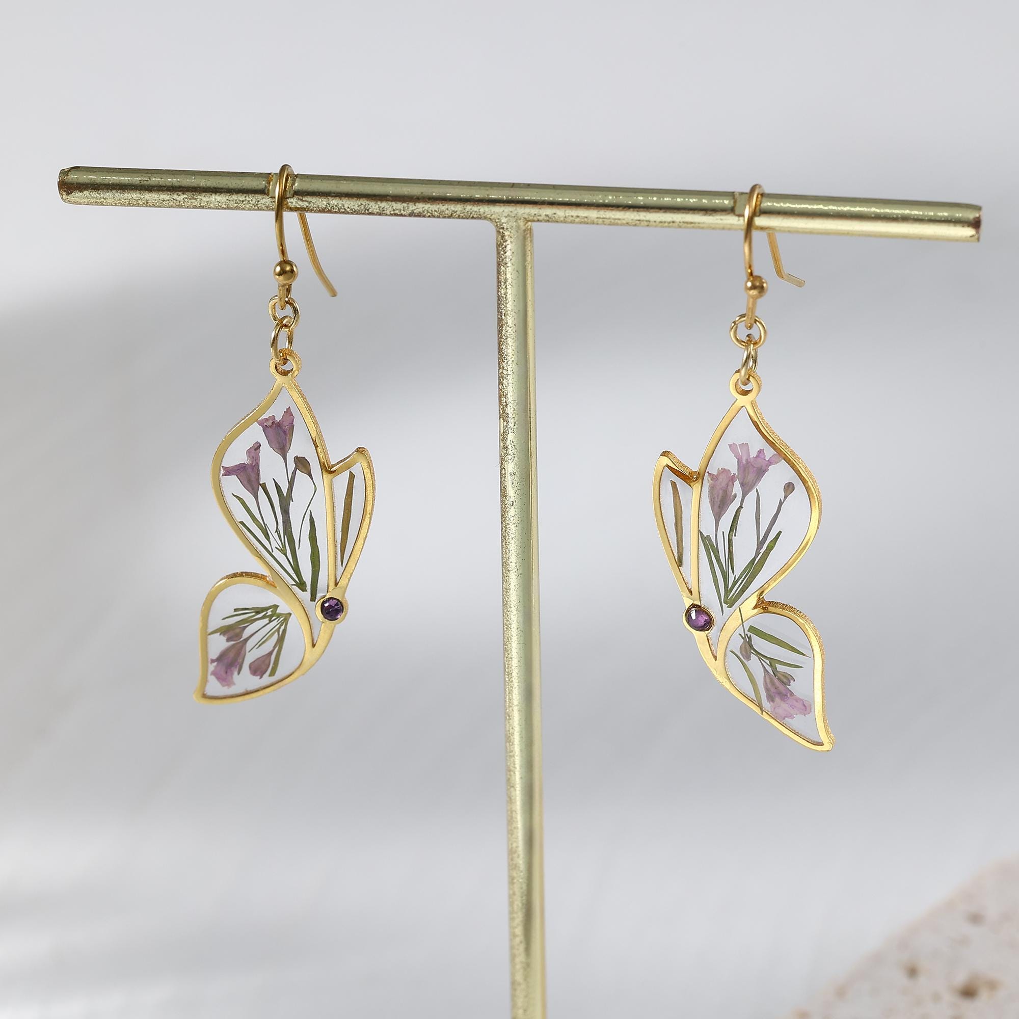 The earrings feature a stunning gold - toned butterfly outline, framing a transparent resin panel that seems to hold a slice of a secret garden. Inside, real dried purple flowers are preserved in all their natural splendor, as if time itself has paused to admire their beauty. The soft hues of the flowers add a touch of romance and whimsy, making these earrings a truly unique accessory.