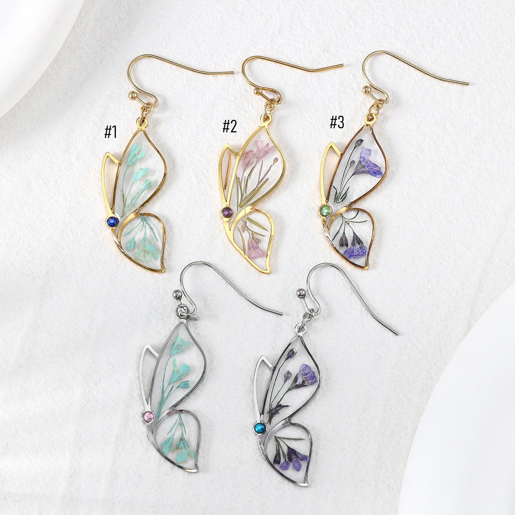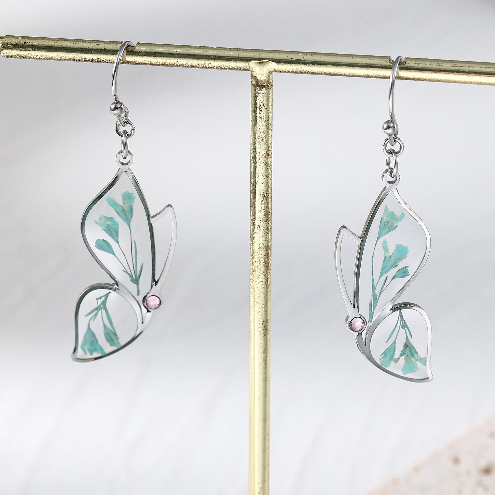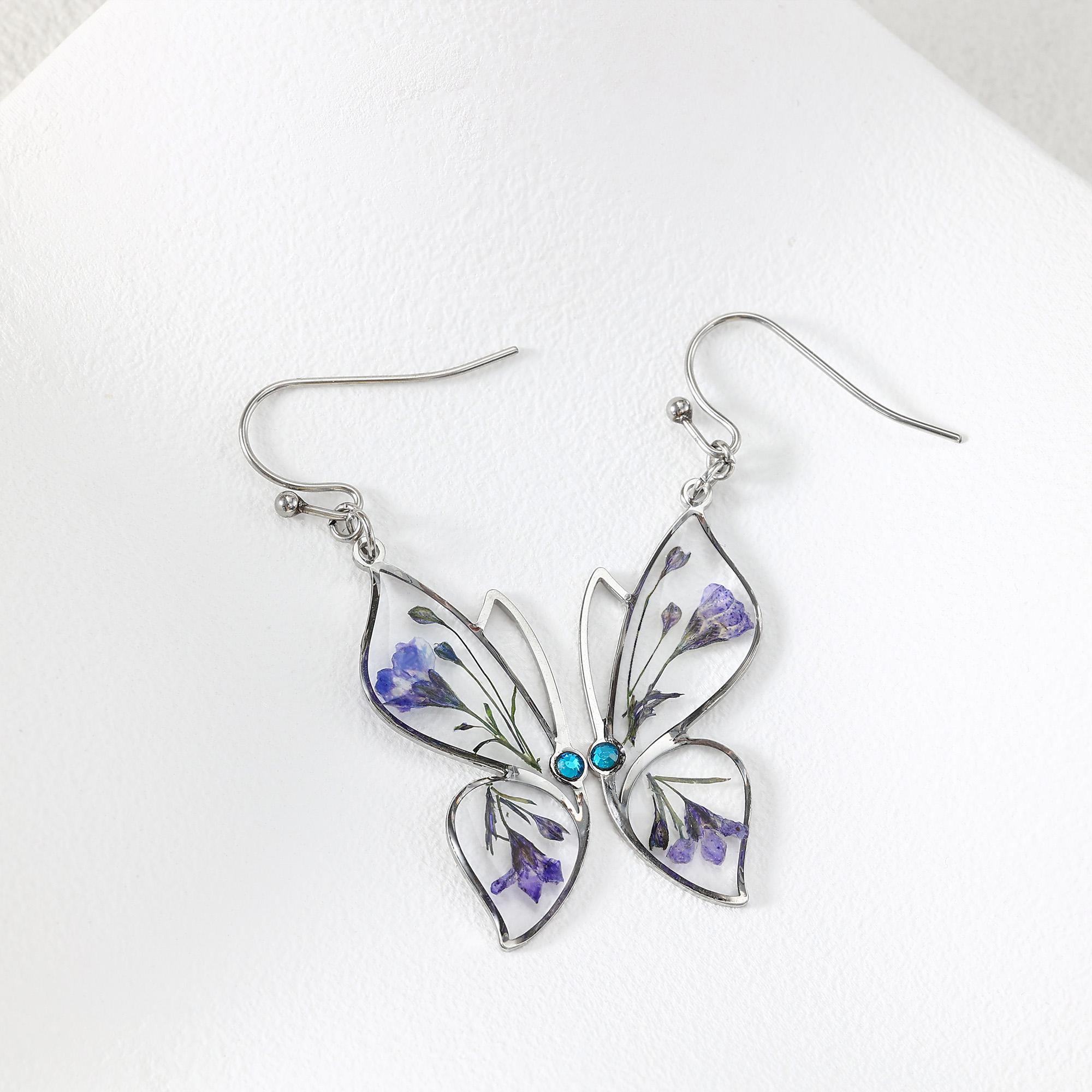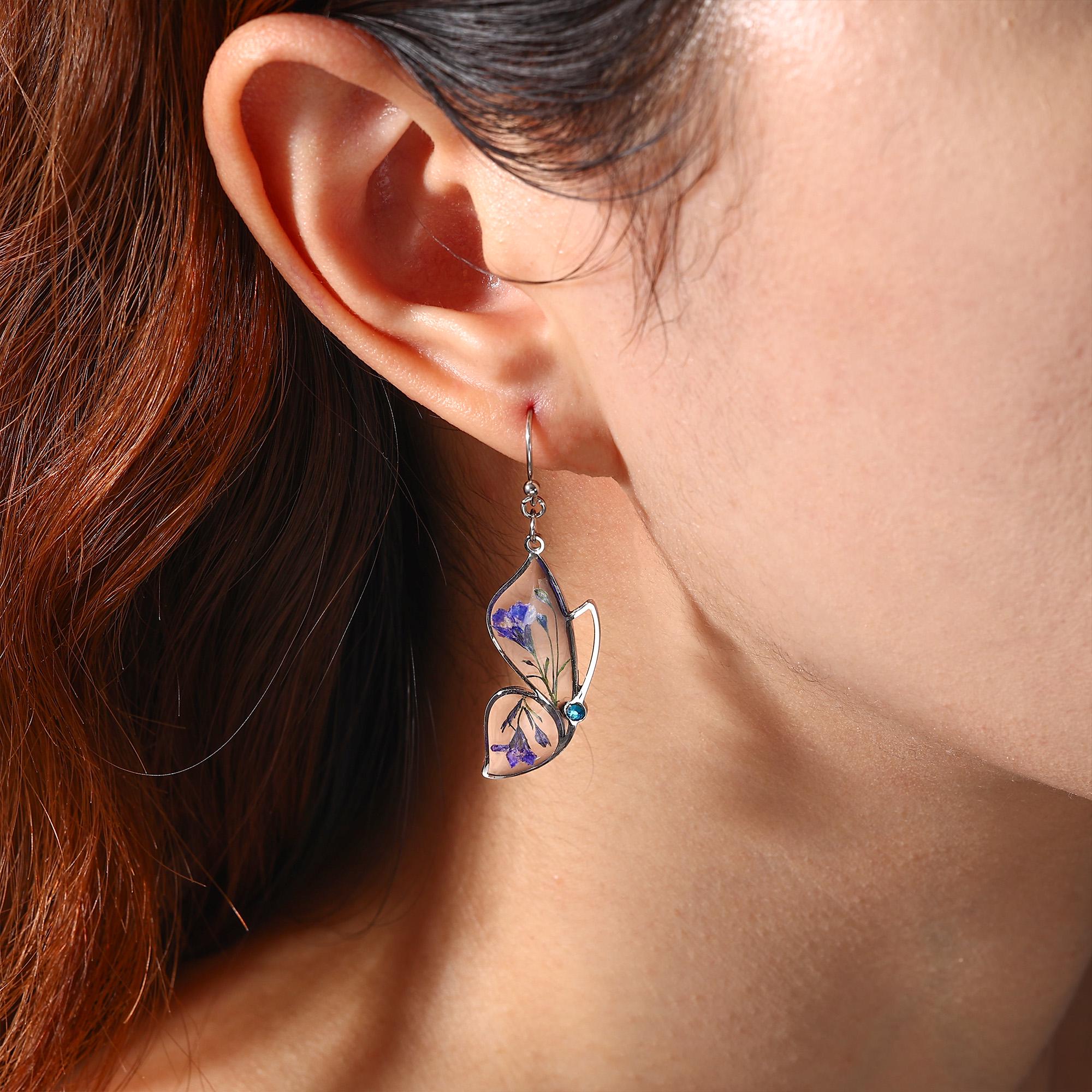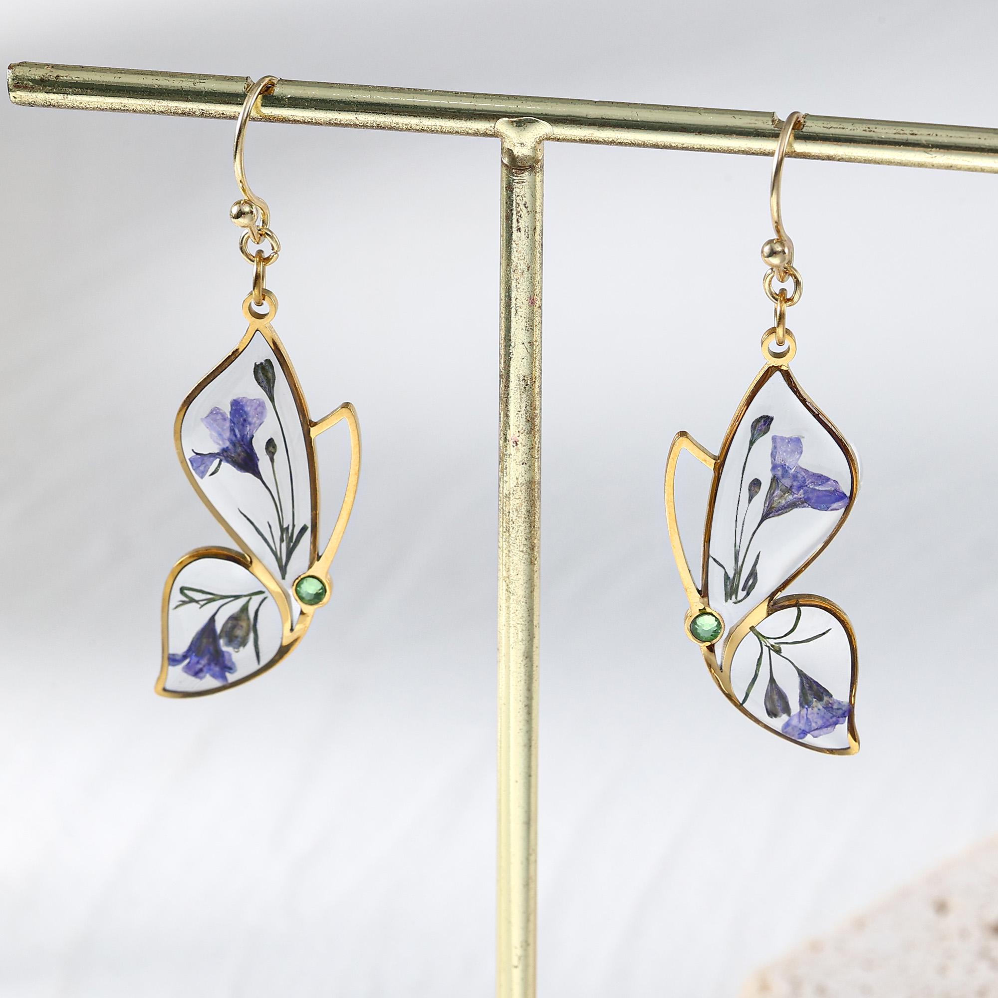 The earrings feature a stunning gold - toned butterfly outline, framing a transparent resin panel that seems to hold a slice of a secret garden. Inside, real dried purple flowers are preserved in all their natural splendor, as if time itself has paused to admire their beauty. The soft hues of the flowers add a touch of romance and whimsy, making these earrings a truly unique accessory.