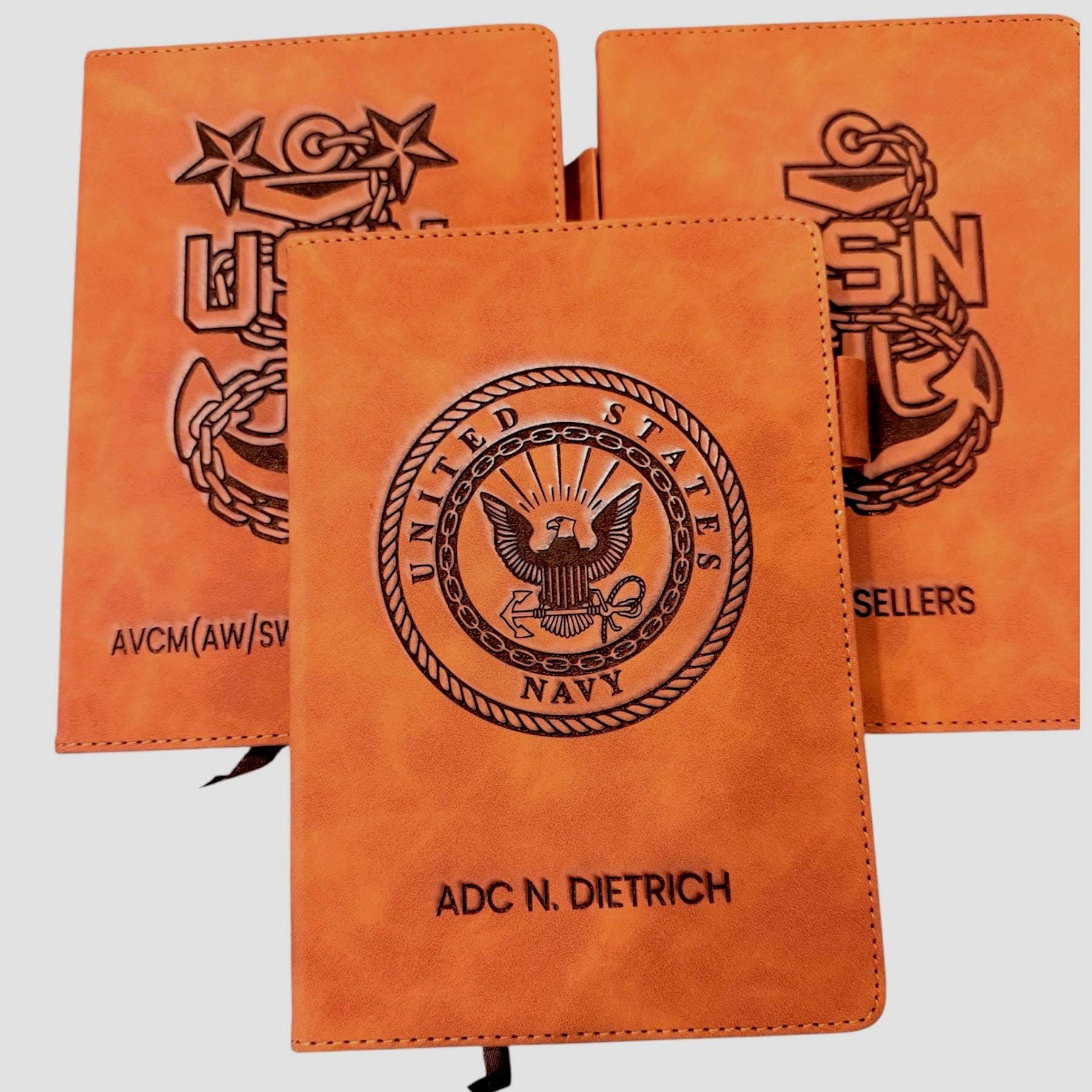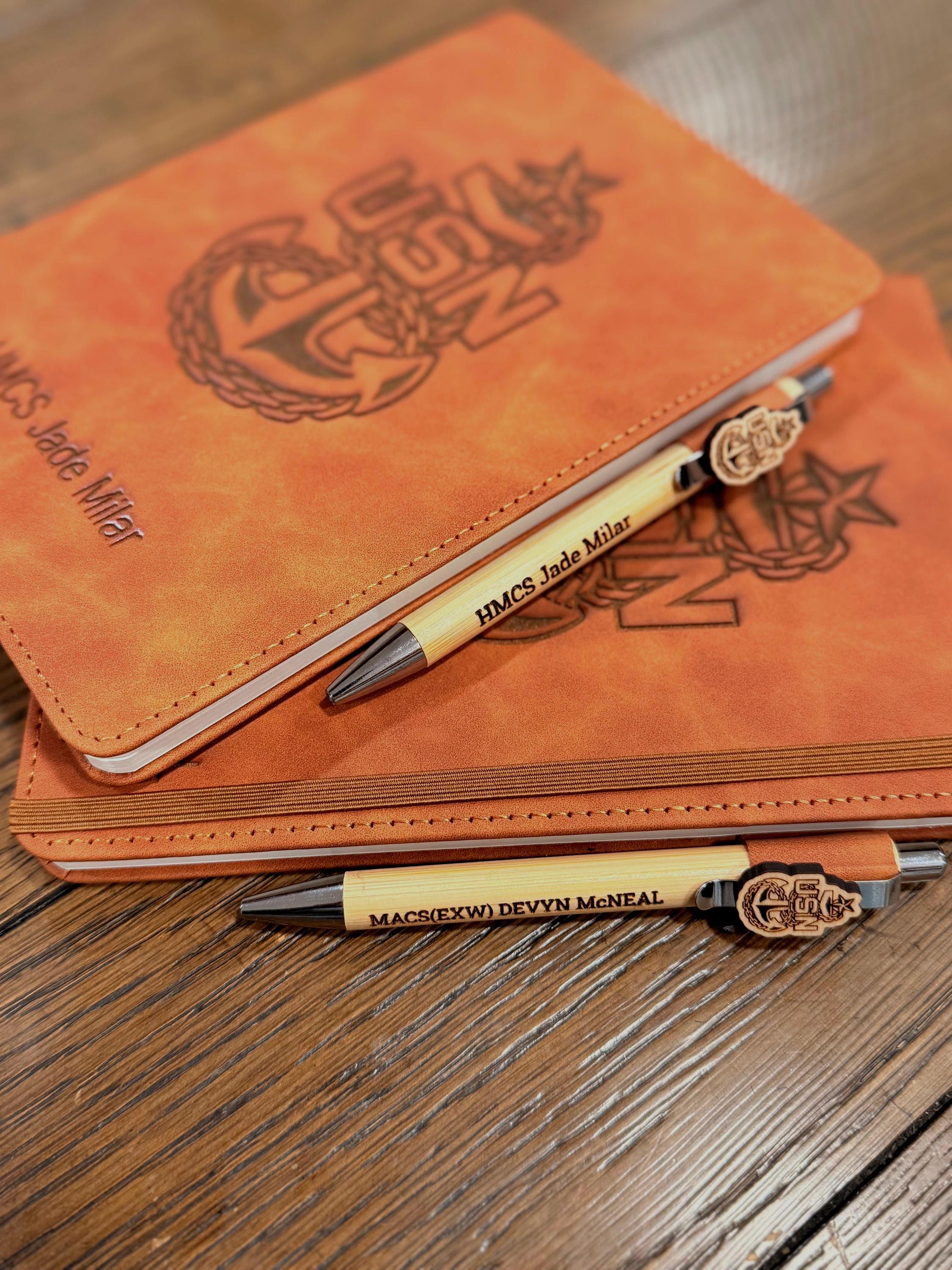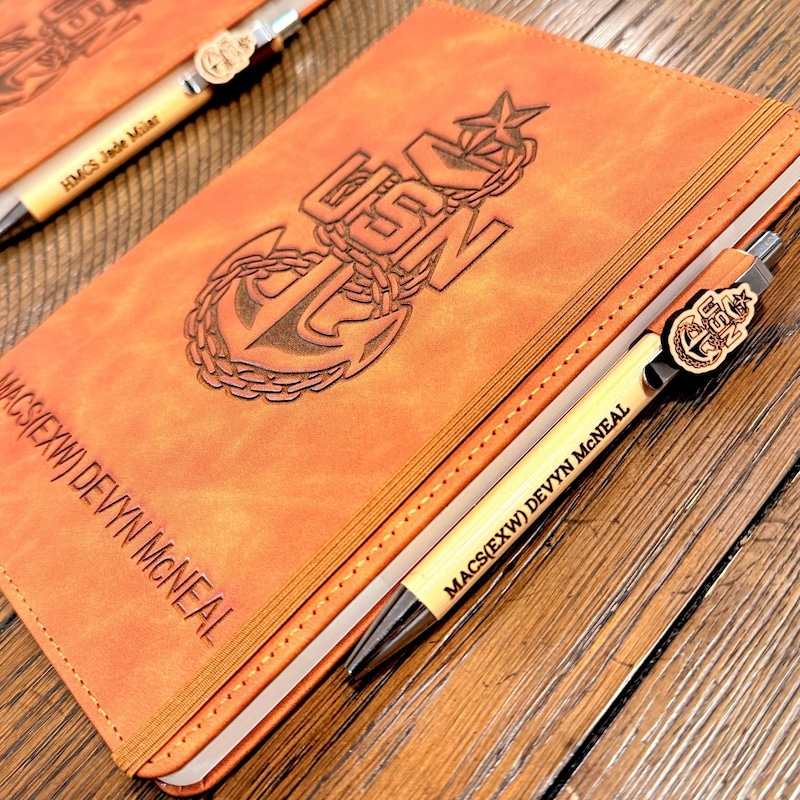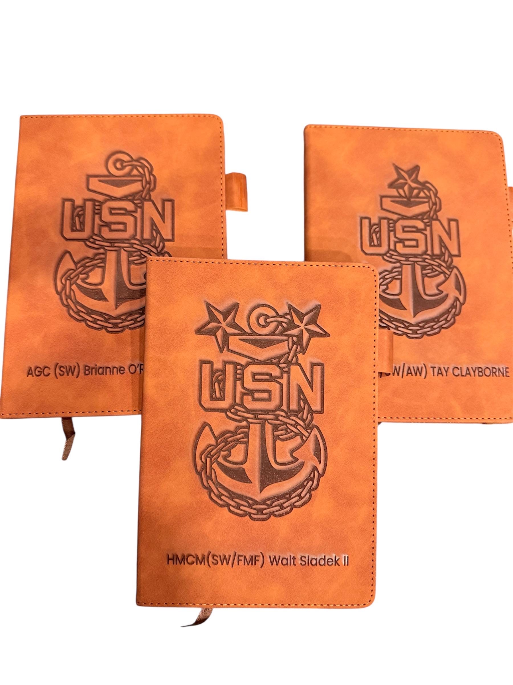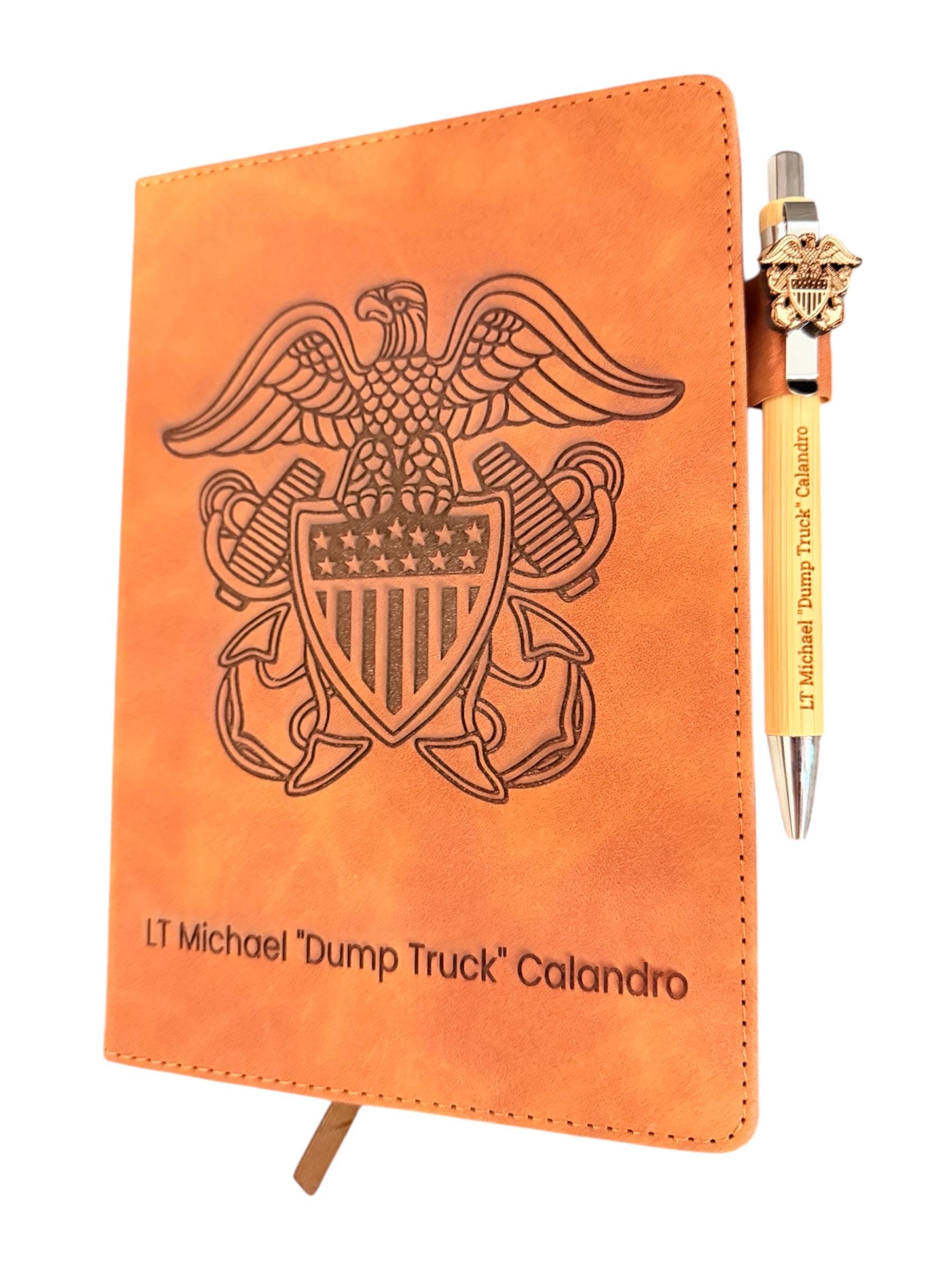 Honor your service with this personalized US Navy A5 journal. Its durable, laser-engraved cover proudly displays the official Navy emblem, creating a distinguished and professional appearance.