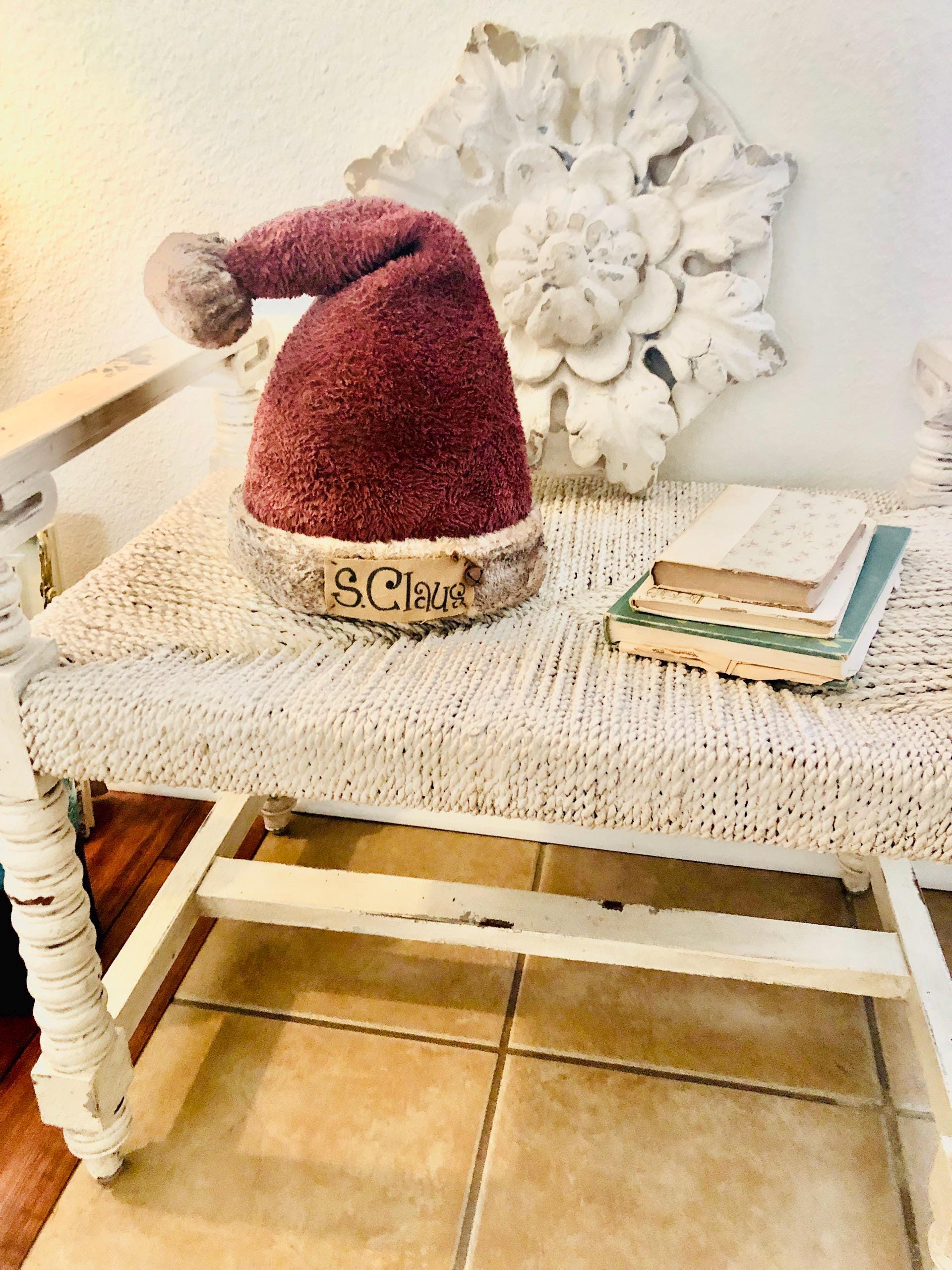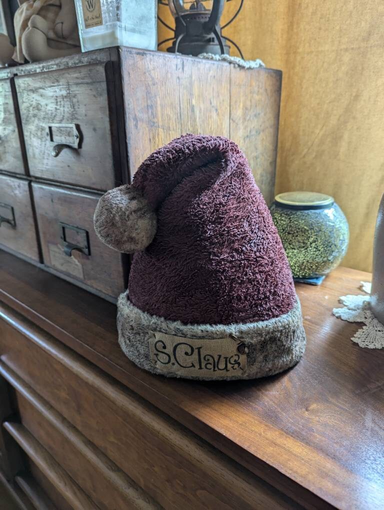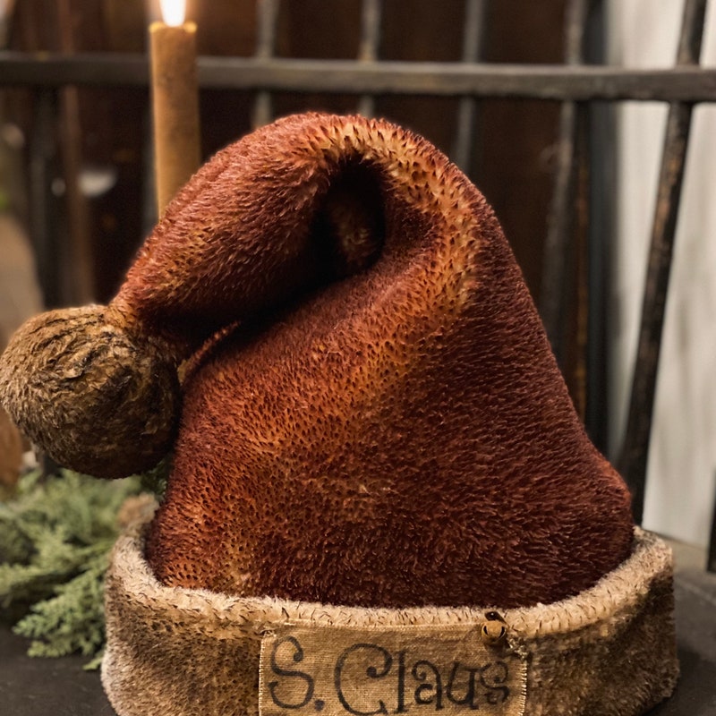 Unique design - Primitive Santa hat made from faux fur that has been heavily aged and painted in a multiple step process for an olden look. The hat measures approximately 14” in length and 10” in height when folded over the one side. Embrace the festive spirit with our Custom Primitive Santa Hat! Handcrafted with love, this cozy and charming accessory is perfect for the holiday season. Made from soft, high-quality materials, it features a traditional design that captures the essence of Christmas.